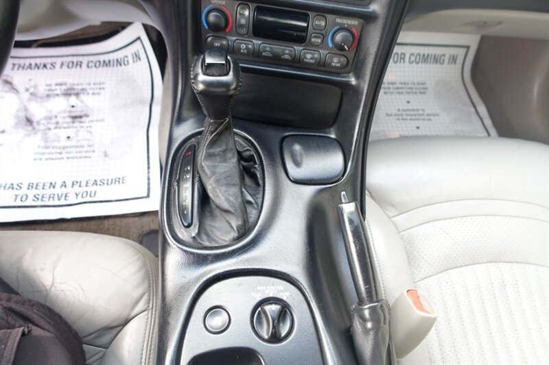 Inside, this Corvette came standard with leather seating surfaces and power-adjustable front seats, power windows, door locks and mirrors, automatic climate control, cruise control, and an onboard driver information center/trip computer. The factory audio system delivers AM/FM and CD capability with clean, simple controls — premium audio (Bose) was available as a factory option. Safety equipment from the factory includes dual front airbags and solid crash-structure engineering. Exterior features include the Corvette’s aerodynamic composite body panels and the signature low, aggressive stance — coupe models include a removable roof panel (targa); convertible configurations were also offered from the factory.